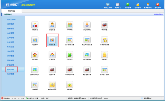 在功能導(dǎo)航窗中點(diǎn)擊“基礎(chǔ)資料”—》“商品信息”,即可進(jìn)入“商品信息”界面,如圖: