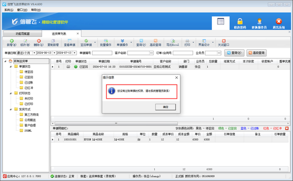 信管飛送貨單軟件通過狀態(tài)控制實(shí)現(xiàn)簡(jiǎn)單的流程管理(待簽回—》已簽回—》已結(jié)賬),有用戶在過賬單據(jù)時(shí),系統(tǒng)彈出提示信息“您沒有過賬單據(jù)的權(quán)限,請(qǐng)與系統(tǒng)管理員聯(lián)系!”,如下圖所示。