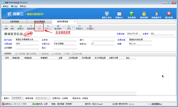 發(fā)票管理模塊是屬于擴(kuò)展模塊,只有在信管飛RMS標(biāo)準(zhǔn)版和專業(yè)版中才能使用。有用戶在使用發(fā)票管理模塊過程中,無法修改進(jìn)/銷項發(fā)票,如下圖所示。