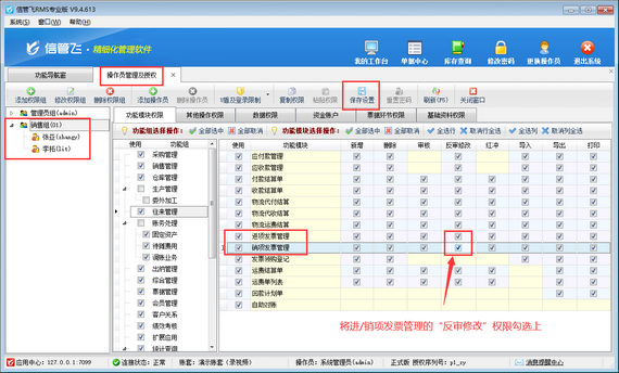 出現(xiàn)以上問題的原因是:操作員賬號沒有反審修改發(fā)票的權(quán)限。解決方法如下:使用系統(tǒng)管理員賬號登錄軟件,在功能導(dǎo)航窗點擊“系統(tǒng)管理”—》“操作員及授權(quán)”打開“操作員管理及授權(quán)”界面,選擇操作員賬號,在功能模塊權(quán)限內(nèi)選擇“往來管理”模塊,將進(jìn)/銷項發(fā)票管理的“反審修改”權(quán)限勾選上,然后保存權(quán)限設(shè)置,如下圖所示。