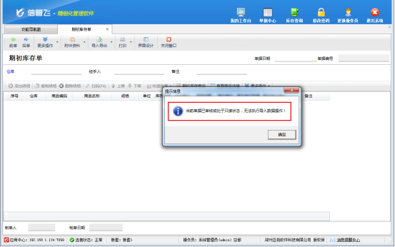 進(jìn)入期初庫(kù)存單界面,點(diǎn)擊導(dǎo)入,提示“當(dāng)前單據(jù)已審核或處于只讀狀態(tài),無(wú)法執(zhí)行導(dǎo)入數(shù)據(jù)操作!”,如圖: