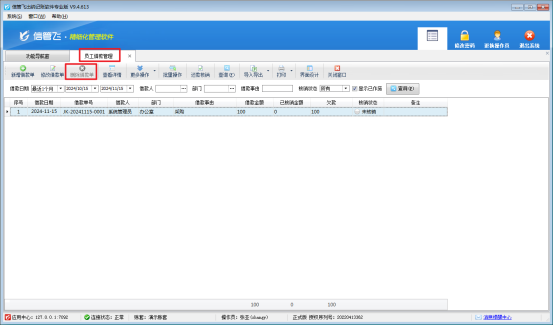 操作員權限設置完成后,切換操作員“張亞”登錄軟件,在功能導航窗點擊“綜合管理”—》“員工借款管理”打開員工借款管理界面,此時可以看到操作員賬號已無法刪除借款單了,如下圖所示。