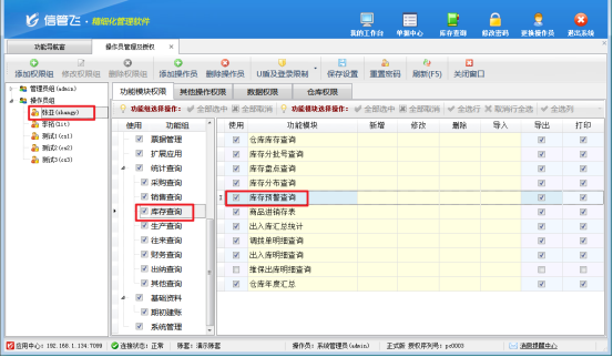 首先使用系統(tǒng)管理員賬號(hào)登錄軟件,在功能導(dǎo)航窗點(diǎn)擊“系統(tǒng)管理”—》“操作員及授權(quán)”打開(kāi)操作員管理及授權(quán)界面,選擇操作員“張亞”,在其右側(cè)的功能模塊權(quán)限內(nèi)選擇“庫(kù)存查詢(xún)”,將庫(kù)存預(yù)警查詢(xún)勾選,然后保存權(quán)限設(shè)置,如下圖所示: