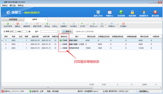 單據(jù)審核狀態(tài)是指在業(yè)務(wù)流程中,單據(jù)處于審核流程的不同階段所呈現(xiàn)的狀態(tài),它反映了單據(jù)處理進(jìn)展與結(jié)果,信管飛RMS開單審核后查詢界面顯示審核狀態(tài),在對賬統(tǒng)計打印時,支持打印單據(jù)的審核狀態(tài)。