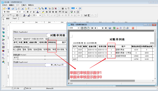 打印對賬單時同樣需要打印“審核狀態(tài)”,但是在設(shè)計模板時直接調(diào)用[統(tǒng)計信息."審核"]數(shù)據(jù)項,打印預(yù)覽對賬單時,審核狀態(tài)會顯示為數(shù)字,而不是文字內(nèi)容,如下圖所示。