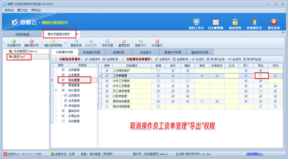 具體操作步驟簡(jiǎn)單明了:登錄軟件后,進(jìn)入“系統(tǒng)管理”的“操作員及授權(quán)”界面,選擇對(duì)應(yīng)操作員并取消其工資單管理的“導(dǎo)出”權(quán)限,保存設(shè)置即可。