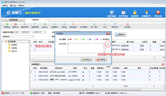 在訂單列表界面雙擊標(biāo)記備注,點(diǎn)右側(cè)標(biāo)記可以選擇已維護(hù)數(shù)據(jù)字典。
