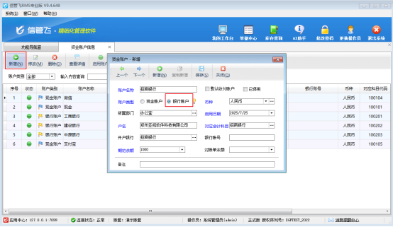 點(diǎn)擊工具欄中的“新增”按鈕,在彈出的“資金賬戶—新增”窗口錄入賬戶名稱、勾選賬戶類型“銀行賬戶”、期初余額及其他相關(guān)信息后點(diǎn)擊“保存”按鈕即可保存到系統(tǒng)內(nèi),如下圖