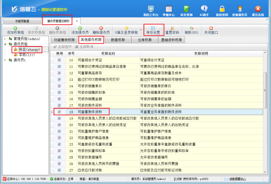 首先,使用系統管理員賬號登錄軟件,點擊功能導航窗,“系統管理”—》“操作員及授權”,進入操作員管理及授權界面中,選擇操作員賬號,進入“其他操作權限”界面,勾選“可查看附件資料”權限,然后點擊保存權限設置。