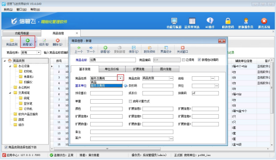 在功能導航欄“基礎資料”----“商品信息”模塊下新增商品性質“服務及費用”的商品,商品名稱命名為“運費”,如下圖所示,搬工費和跑腿費操作方式一樣。