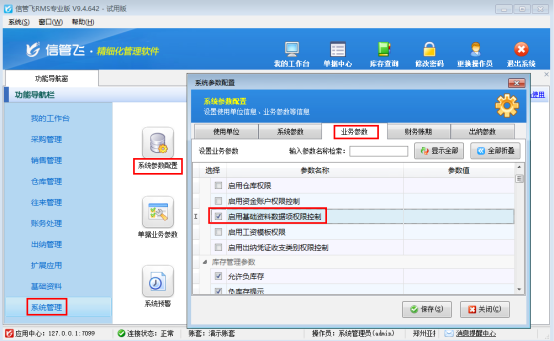 進(jìn)入「系統(tǒng)管理」→「系統(tǒng)參數(shù)配置」→「業(yè)務(wù)參數(shù)」,在“系統(tǒng)安全及權(quán)限參數(shù)”中勾選“啟用基礎(chǔ)資料數(shù)據(jù)項權(quán)限控制”,保存即可。