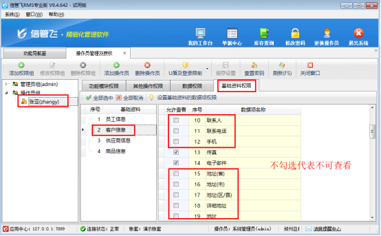 設(shè)置完成后,被限制的操作員登錄系統(tǒng)時,客戶信息中的聯(lián)系電話、手機、地址等敏感字段將自動隱藏,并以星號(*)顯示。