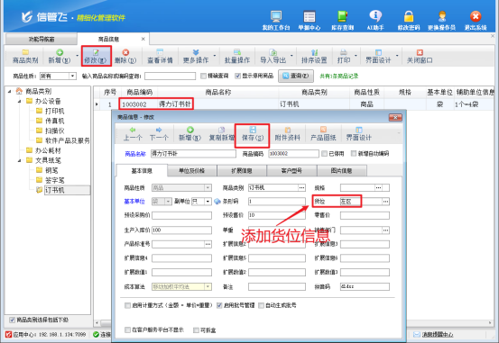 在“商品信息”界面中,您會看到一系列商品列表。找到您想要設置貨位的商品,選中該商品后,點擊界面上的“修改”按鈕。此時,系統(tǒng)會彈出商品信息修改窗口,在這個窗口中,您可以找到專門用于錄入貨位信息的字段。將商品實際存儲的貨位準確錄入后,點擊“保存”按鈕,該商品的貨位信息就設置成功了。