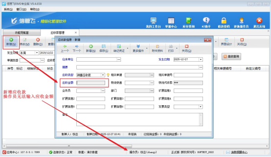 在企業(yè)日常財(cái)務(wù)管理中,使用信管飛進(jìn)銷存軟件新增應(yīng)收款記錄是常見操作。然而,當(dāng)操作員遇到應(yīng)收金額無法輸入的情況時(shí),不僅會(huì)打斷工作流程,還可能影響財(cái)務(wù)數(shù)據(jù)的及時(shí)性與準(zhǔn)確性。本文結(jié)合信管飛進(jìn)銷存軟件提供系統(tǒng)化的解決方案。