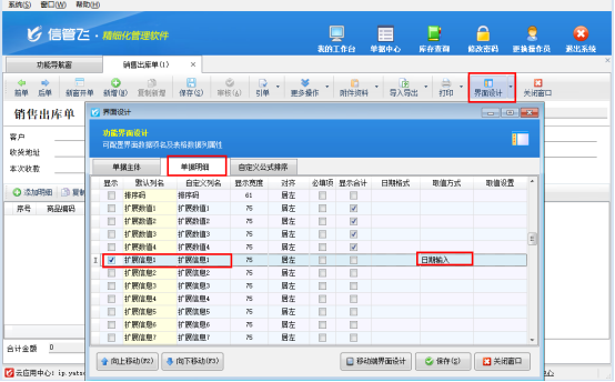2.進入界面設(shè)計的單據(jù)明細設(shè)置板塊,勾選需要顯示的擴展信息項(如擴展信息 1),名稱可自定義修改;