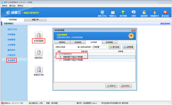 在軟件功能導航窗,依次點擊“系統管理”—》“系統參數配置”—》“業務參數”,進入業務參數設置界面后,勾選“銷售數量不可超過訂單數量”這一參數,點擊“保存”按鈕,即可完成全部配置。
