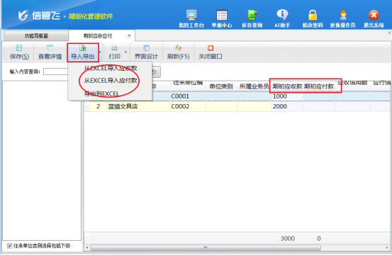 打開信管飛軟件,在功能導(dǎo)航窗點擊“基礎(chǔ)資料”—》“期初建賬”—》“期初應(yīng)收應(yīng)付”,進入“期初應(yīng)收應(yīng)付”界面,操作簡單,路徑清晰,新手也能快速找到。