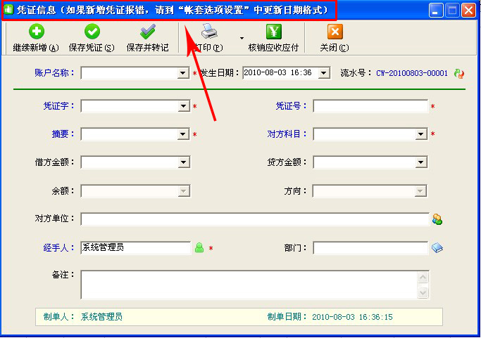 首次下載安裝好好用財務出納記賬系統,在“現金日記賬”或“銀行日記賬”功能中,點擊“新增憑證”進行憑證錄入時,如果出現下圖所示錯誤: 出現這種情況,可能是您電腦格式的問題。修復這個問題,我們使用本系統的“調整日期顯示格式”功能即可。 下面是“調整日期顯示格式”功能的操作步驟: &n