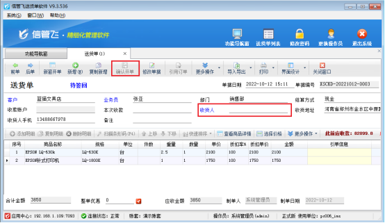 信管飛送貨單軟件、信管飛rms、信管飛倉庫管理軟件等支持開銷售單錄入收貨人信息,便于查詢單據商品是哪位客戶收到的貨物。也有客戶不需要開單時候輸入收貨人,對于不需要錄入收貨人信息的需求,軟件設置是否為必填項來進行控制收貨人是否為空顯示。 以送貨單軟件為例,示范下如何設置開單收貨人允許為空。送貨單界面設置收貨人是必填項