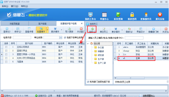演示視頻觀看鏈接:業(yè)務(wù)員離職,所屬客戶如何轉(zhuǎn)給其他業(yè)務(wù)員? 信管飛軟件客戶和供應商都支持設(shè)置所屬業(yè)務(wù)員,針對員工離職,所屬客戶如何轉(zhuǎn)給其他業(yè)務(wù)員,軟件中可以這樣操作,本文以“信管飛RMS軟件”為例,示范下如何批量更改客戶所屬業(yè)務(wù)員為其他員工。 在功能導航