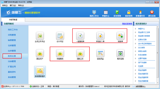 此文章相關(guān)演示視頻:專業(yè)版軟件如何顯示財務(wù)處理輔助單據(jù)演示視頻 信管飛RMS專業(yè)版軟件支持使用財務(wù)處理功能,部分用戶在使用最新版本軟件時,會發(fā)現(xiàn)財務(wù)處理功能沒有一般費用單、其他收入單、調(diào)賬業(yè)務(wù)等功能,這是因為未勾選“顯示財務(wù)處理輔助單據(jù)”參數(shù)導(dǎo)致的,本文以“RMS專業(yè)版”為例介紹下如何顯示財務(wù)處理輔助