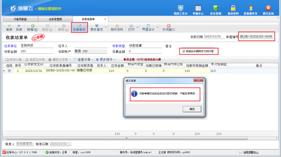 此文章相關(guān)演示視頻:反審修改收款結(jié)算單時(shí)提示對(duì)應(yīng)的應(yīng)收應(yīng)付款已核銷,如何解決演示視頻 信管飛RMS、信管飛出納記賬軟件、信管飛送貨單軟件均支持管理往來賬款,在進(jìn)行收款結(jié)算后可能會(huì)出現(xiàn)收款金額有誤,需要反審修改結(jié)算單的情況,部分用戶在反審修改結(jié)算單時(shí)可能會(huì)出現(xiàn)以下提示:“當(dāng)前單據(jù)對(duì)應(yīng)的應(yīng)收應(yīng)付款已核銷