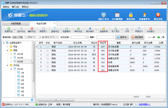 憑證號(hào)是出納憑證的重要標(biāo)識(shí),它記錄了每一筆經(jīng)濟(jì)業(yè)務(wù)的唯一性,對(duì)于后續(xù)的賬務(wù)查詢分析至關(guān)重要。然而,在實(shí)際操作過程中,由于人為錯(cuò)誤或系統(tǒng)調(diào)整等原因,可能會(huì)出現(xiàn)憑證號(hào)斷號(hào)的情況,這不僅影響了賬目的美觀性,還可能給后續(xù)的統(tǒng)計(jì)帶來困擾。信管飛出納軟件的日記賬檢查憑證號(hào)斷號(hào)功能,正是為了解決這一問題而生。問題如下圖所示: &