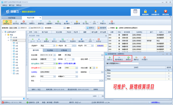 信管飛出納記賬軟件支持在日記賬憑證界面輸入核算項(xiàng)目,也支持按核算項(xiàng)目統(tǒng)計(jì),方便用戶統(tǒng)計(jì)不同項(xiàng)目的日記賬信息。有用戶在登記出納憑證時(shí),只能從已維護(hù)好的核算項(xiàng)目?jī)?nèi)容進(jìn)行選擇,而不能維護(hù)、新增核算項(xiàng)目?jī)?nèi)容,如下圖所示。 演示視頻觀看鏈接:操作員無(wú)法維護(hù)出納憑證的核算項(xiàng)目,如何解決演示視頻 出現(xiàn)以