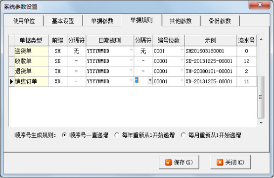 紅管家送貨單軟件中在開單時(shí)軟件會自動生成一個(gè)單據(jù)編號,因此可以對單據(jù)編號規(guī)則進(jìn)行設(shè)置,這樣我們對單據(jù)進(jìn)行查詢時(shí)可根據(jù)單據(jù)編號就可以讀取單據(jù)信息,軟件中支持根據(jù)自己的實(shí)際業(yè)務(wù)需求來設(shè)置單據(jù)規(guī)則,下面我們演示一下具體的操作步驟。 在主窗口菜單“系統(tǒng)管理”—》“系統(tǒng)參數(shù)設(shè)置”菜單項(xiàng),點(diǎn)擊“單據(jù)規(guī)則”,如下圖1所示:圖11、單據(jù)編號