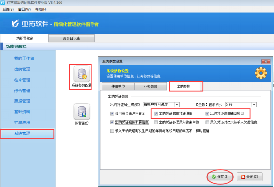 紅管家出納記賬軟件、亞拓管理軟件(標(biāo)準(zhǔn)版、專業(yè)版)中的出納管理模塊,在新增憑證中有的需要填寫輔助項(xiàng)目和憑證明細(xì),軟件支持設(shè)置在新增憑證時(shí)顯示這些項(xiàng)目。下邊以出納軟件為例,展示一下如何設(shè)置憑證顯示憑證明細(xì)和輔助項(xiàng)目項(xiàng)。 打開“系統(tǒng)管理”—》“系統(tǒng)參數(shù)”,選擇出納參數(shù)界面選擇對(duì)應(yīng)的出納參數(shù)進(jìn)行勾選保存。具體如下圖1所示: