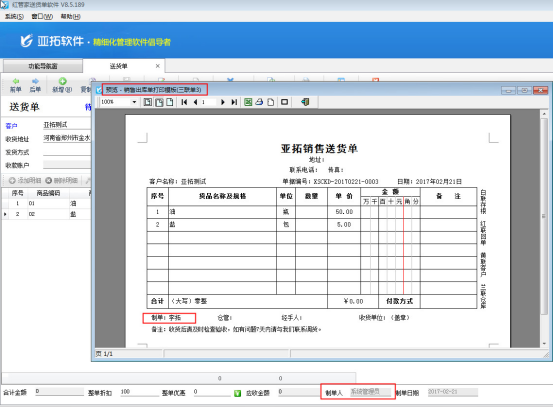 紅管家送貨單軟件、亞拓管理軟件、紅管家倉庫管理軟件都支持開單打印送貨單(銷售單),打印模板中的制單人,默認是當前登錄軟件的操作員,有的客戶需要打印模板統一為一個制單人,就需要在打印模板中固定制單人名字。 以送貨單軟件為例,示范如何在打印模板中直接固定制單人名字,選擇一個送貨單單據,選擇“打印”—》“打