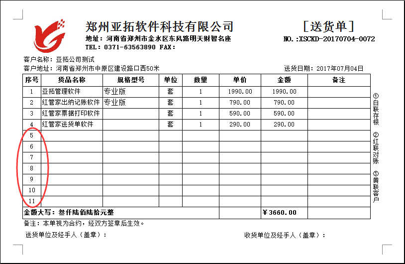 紅管家送貨單軟件、紅管家倉(cāng)庫(kù)管理軟件及亞拓管理軟件等都支持開單打印單據(jù),軟件內(nèi)置了十幾種打印格式模版供客戶選擇使用,同時(shí)也支持自定義打印格式模版。一般情況下打印模版設(shè)置自動(dòng)增加空行時(shí),空白行會(huì)不再顯示行號(hào),如下圖一所示,如何設(shè)置才能讓表格一直顯示序號(hào)(行號(hào)),即使追加的空行也顯示?本篇文章以紅管家送貨單軟件為例來(lái)示范一下如何設(shè)置才能讓表格一直顯示序號(hào)(行號(hào))。