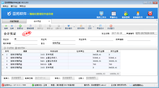 亞拓管理軟件專業(yè)版包含的有財(cái)務(wù)處理模塊,其中結(jié)轉(zhuǎn)損益是指在期末,將損益類科目的余額全部結(jié)轉(zhuǎn)到“本年利潤(rùn)”中,并生成相應(yīng)的會(huì)計(jì)憑證,結(jié)轉(zhuǎn)后,損益類科目余額為零的過(guò)程。本篇文章我們來(lái)介紹一下結(jié)轉(zhuǎn)損益功能如何使用? 在功能導(dǎo)航窗點(diǎn)擊“財(cái)務(wù)處理”—“結(jié)轉(zhuǎn)損益”,即可打開結(jié)轉(zhuǎn)損益窗口。圖一 結(jié)轉(zhuǎn)損益