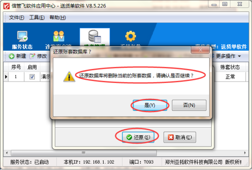 亞拓旗下所有軟件安裝完成后,數(shù)據(jù)備份均保存在安裝軟件目錄下的賬套文件備份文件夾中,如需要更換電腦使用,需要把最近日期的備份數(shù)據(jù)復(fù)制到新的電腦上,在新的電腦上安裝好軟件,在應(yīng)用中心程序中對(duì)之前的賬套備份數(shù)據(jù)進(jìn)行還原操作,就可以把之前的所有數(shù)據(jù)同步到這個(gè)電腦上。 本文章以信管飛送貨單軟件為例,示范下如何還