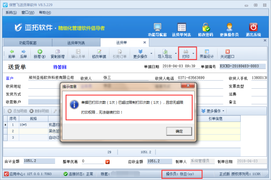 亞拓管理軟件(星光版、標(biāo)準(zhǔn)版、專業(yè)版)、信管飛送貨單軟件、信管飛倉(cāng)庫(kù)管理軟件等都支持設(shè)置報(bào)表的打印次數(shù),來(lái)限制打印單據(jù)的次數(shù)。通過(guò)設(shè)置打印次數(shù)來(lái)提示此單據(jù)已打印過(guò),避免開(kāi)單打印單據(jù)后又修改單據(jù),出現(xiàn)打印的單據(jù)和軟件內(nèi)容不一致的情況。為了避免多個(gè)操作員開(kāi)單修改打印單據(jù)出錯(cuò)的情況。軟件可以設(shè)置操作員不能超過(guò)指定的打印次數(shù)權(quán)限。 &n