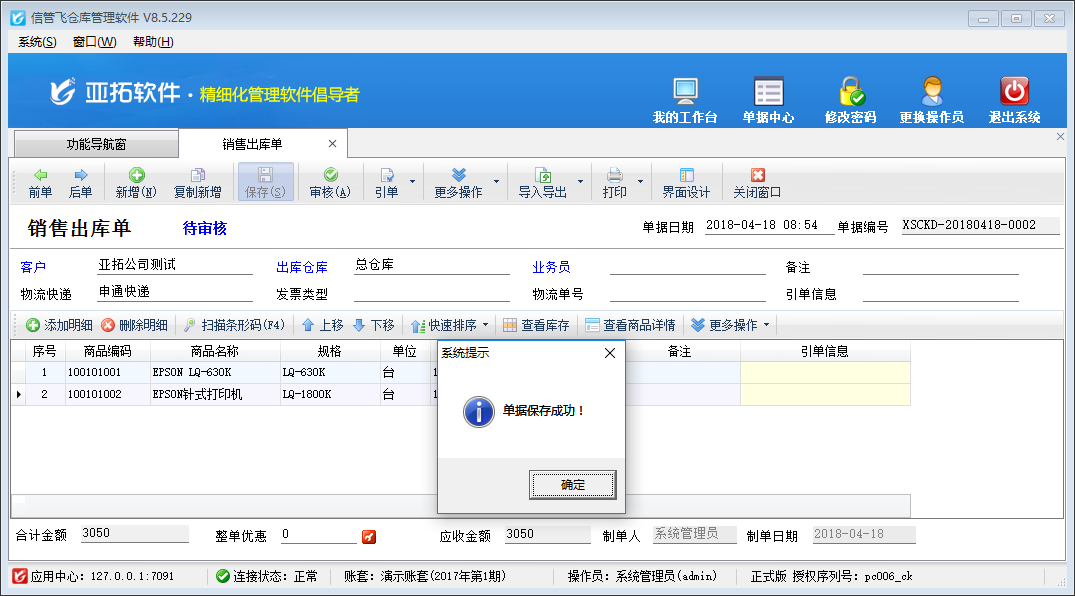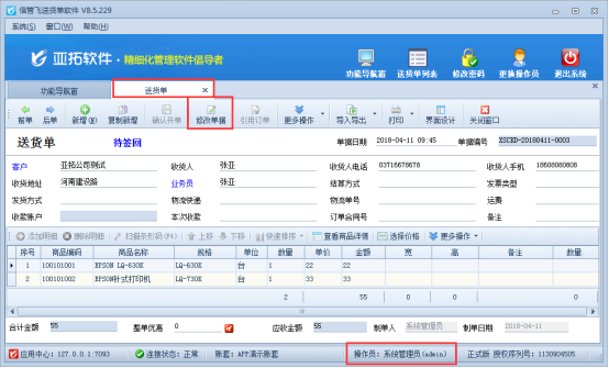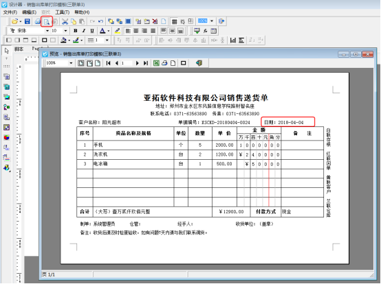 亞拓管理軟件、信管飛倉(cāng)庫(kù)管理軟件、信管飛送貨單軟件為了滿足更多客戶的需求,軟件可自定義設(shè)置打印模板單據(jù)日期的顯示格式。本文以信管飛送貨單軟件為例,介紹一下如何修改打印模板中的單據(jù)日期的顯示格式。 登錄軟件,開(kāi)一個(gè)送貨單單據(jù),打印預(yù)覽圖和單據(jù)界面如圖1所示,模板界面日期顯示的是“2018年04月04日”,下面我們把日期格式修改