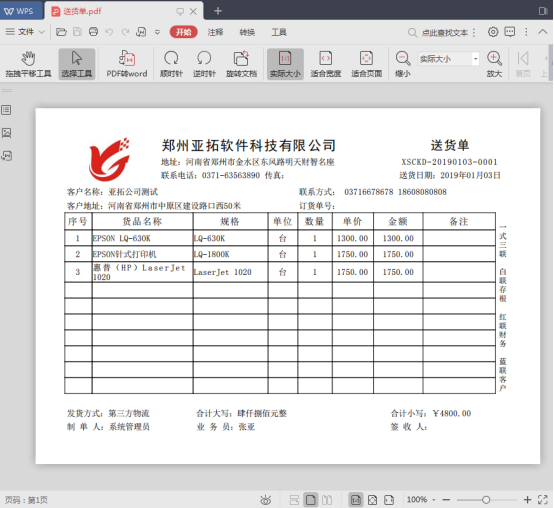 信管飛送貨單軟件、信管飛RMS、信管飛倉庫管理軟件等都支持打印送貨單(銷售單),軟件支持把送貨單預覽界面導出到Excel文件、Html文件、Text文件及jpg、pdf等電子檔格式,方便用戶導出送貨單的電子檔給客戶看,方便客戶可以隨時查看送貨單內(nèi)容。下面我們以信管飛送貨單軟件為例講一下如何把送貨單預覽界面導出為pdf格式。