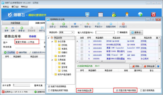 信管飛倉庫管理軟件、信管飛RMS軟件等都支持開單時選擇系統(tǒng)已錄入的商品信息,進行快速選擇多個商品開單,在選擇商品的時候默認顯示的是所有商品(如圖所示),有部分客戶想在選擇商品窗口僅顯示出此客戶的相關產(chǎn)品,本文我們以“信管飛倉庫管理軟件”為例示范下如何在選擇商品窗口僅顯示客戶相關商品。 在功能導航窗點擊