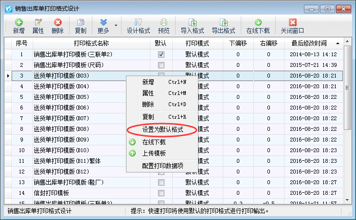 信管飛送貨單軟件、信管飛RMS軟件、信管飛倉庫管理軟件等在軟件內(nèi)都內(nèi)置了多種打印格式,除此之外,軟件也支持自定義設計打印格式模板,為了開單打印單據(jù)方便,軟件可以把常用的模板設置為默認模板,開單保存后直接進行打印操作。不需要再次選擇模板進行打印。 本文以信管飛RMS為例,示范下如何設置常用的打印模板為默認模板。首先打開銷售出庫