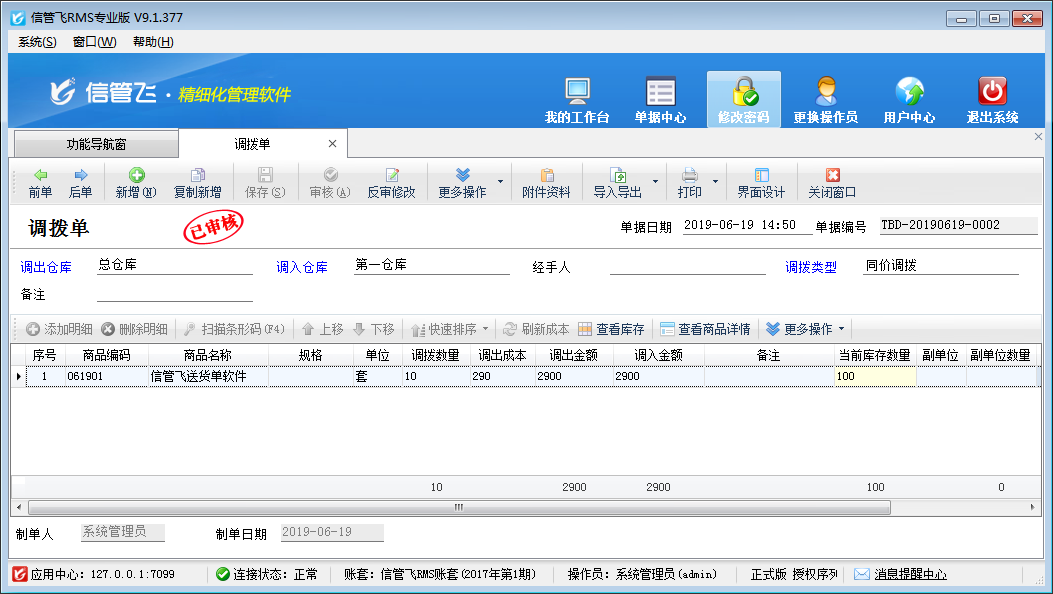 信管飛RMS及信管飛倉庫管理軟件都支持調(diào)撥單,調(diào)撥單主要用于庫存商品在各倉庫之間的調(diào)貨。調(diào)撥分為同價調(diào)撥和變價調(diào)撥兩種,其中同價調(diào)撥方式,商品的成本價以調(diào)出倉庫的成本價為準;變價調(diào)撥(或稱“異價調(diào)撥”),商品的成本價可進行修改,一般用于分攤運費/裝卸費等運輸費用。總部到門店的調(diào)撥一般采用變價調(diào)撥。 在功能導航窗點“倉庫管理”