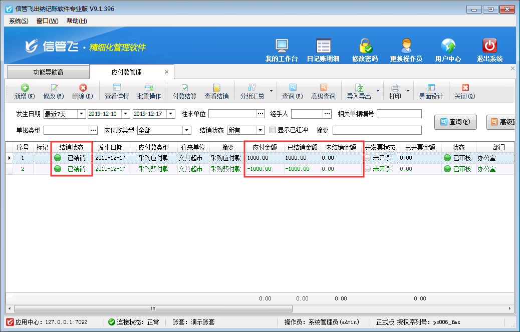 采購預(yù)付款是我們提前預(yù)付給供應(yīng)商的金額,可以用來沖銷采購產(chǎn)生的應(yīng)付款,本文以信管飛出納記賬軟件專業(yè)版為例演示一下如何使用采購預(yù)付款沖銷采購應(yīng)付款? 在功能導(dǎo)航窗點(diǎn)擊“往來管理”—》“應(yīng)付款管理”打開應(yīng)付款管理界面,如下圖所示,在應(yīng)付款管理內(nèi)對同一個(gè)供應(yīng)商分別新增一條應(yīng)付款記錄,一條預(yù)付款記錄,結(jié)銷狀態(tài)為“未結(jié)銷”狀態(tài),已結(jié)銷