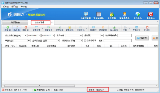 信管飛送貨單軟件是集送貨單開單打印和應收款管理為一體的軟件,軟件支持設置多操作員登錄以及可設置操作員的權限。有時需要操作員僅能開單,不可查看應收款記錄該如何設置?本文以“信管飛送貨單軟件”為例,示范如何設置操作員不可查看應收款? 用“系統管理員”登錄軟件,在功能導航窗點擊“業務處理”—》“應收款管理”