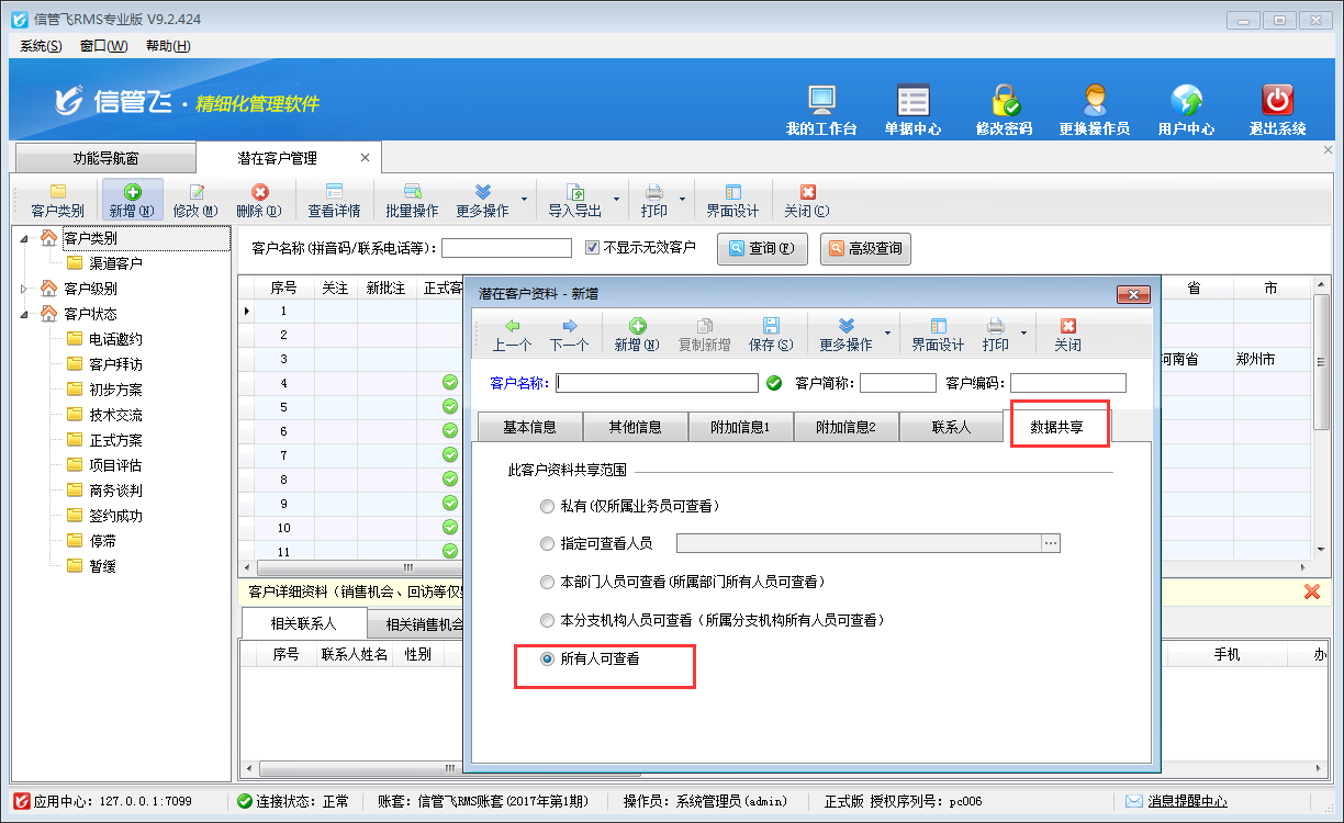 銷售機會管理用于管理在推銷過程中,由于環境發生變化,給銷售人員提供的實現其推銷目的的一種可能性,即銷售線索,各種途徑搜集過來的銷售業務信息(如客戶需求、購買意向、招投標信息等)。銷售機會信息可根據共享范圍進行設置,實現銷售機會的分級管理。本篇文章介紹一下如何批量設置銷售機會共享范圍? 在功能導航窗點擊“客戶關系”—》“銷售機