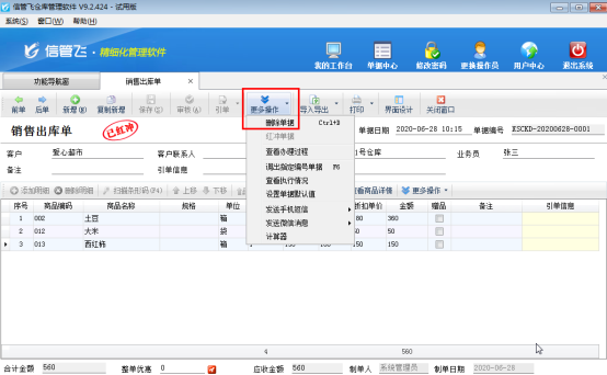 信管飛RMS(進銷存管理軟件)、信管飛倉庫管理軟件中業務單據已審核后默認是不允許刪除的,如下圖所示,刪除按鈕為灰色的,不可操作,那么如果單據審核后發現此單做錯了,需要刪除,如何操作呢?本篇文章詳細介紹一下倉庫管理軟件內如何刪除已審核的業務單據? 業務單據已審核后默認是不允許刪除的,如果需要刪除,需要先紅沖此單據,然后再刪除,