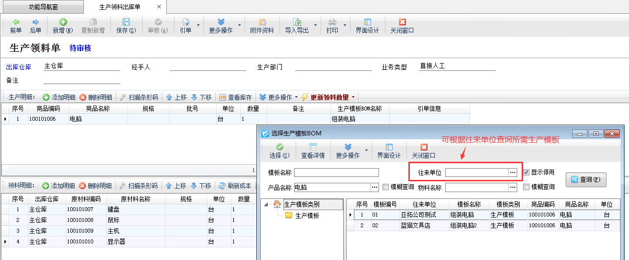 生產任務單,即生產過程中的任務加工單,用于執行生產計劃,進入實際生產階段。生產任務單分為生產明細和用料明細兩部分,生產明細中添加需要生產的產成品,然后根據選擇的生產模板可自動顯示生產產成品所需要的用料明細信息,如下圖所示。 另外軟件也支持配置根據原材料用料數量及原材料當前庫存數量自動計算出原材料需采購的數量,進而生成采購訂單
