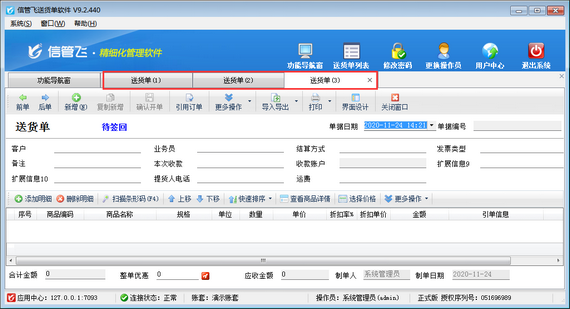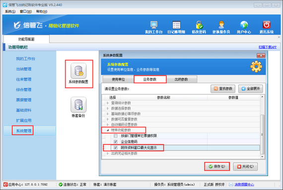 信管飛送貨單軟件支持多窗口同時開單,軟件默認(rèn)同時只能填開一張送貨單,如果單據(jù)比較多,需要同時填開多張送貨單的情況下,可以根據(jù)本文介紹進(jìn)行參數(shù)配置,示例如下: 在功能導(dǎo)航窗點(diǎn)擊“系統(tǒng)管理”—》“系統(tǒng)參數(shù)配置”—》“業(yè)務(wù)參數(shù)”打開業(yè)務(wù)參數(shù)配置界面,然后在業(yè)務(wù)單據(jù)相關(guān)參數(shù)內(nèi),勾選啟用“銷售單允許多窗口開單”參數(shù),并設(shè)置下參數(shù)值(同