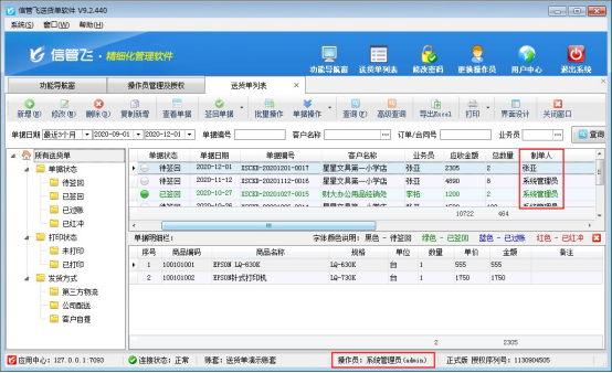 信管飛送貨單軟件支持設(shè)置多個操作員登錄軟件,為避免不同操作員登錄軟件查看其他人單據(jù),軟件支持設(shè)置操作員權(quán)限,只能查看自己的開單單據(jù),以“送貨單”為例,示范下如何設(shè)置操作員只能查看自己的單據(jù)。 功能導(dǎo)航窗點(diǎn)擊“系統(tǒng)管理”—》“操作員及授權(quán)”進(jìn)入操作員管理及授權(quán)界面。添加操作員“張亞”,添加后選擇此操作員