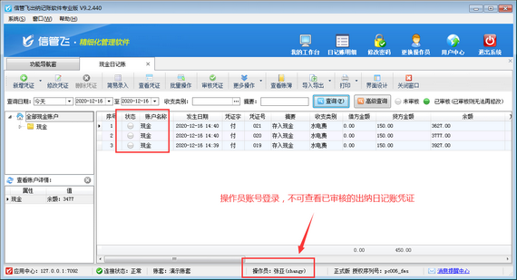 信管飛出納記賬軟件、信管飛RMS標準版和專業版都支持設置操作員不可查看已審核的出納日記賬憑證,本篇文章以信管飛出納記賬軟件專業版為例詳細介紹一下如何設置操作員不可查看已審核的出納日記賬憑證。 在功能導航窗點擊“系統管理”→“操作員及授權”即可進入“操作員管理及授權”界面,選中操作員賬號,然后在“其他操作權限”界面將“不可查看