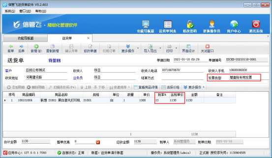 信管飛送貨單軟件、信管飛RMS軟件等都支持打印單據,軟件內置了十幾種打印模板以供使用。默認打印模板的金額是按財務樣式進行顯示的,默認金額格式是按7位顯示,只顯示到萬,如果出現金額超過萬位會顯示不出來(如下圖所示),本文以“信管飛送貨單軟件”為例,示范下如何修改金額樣式的顯示數字個數。     打開送貨單開單界