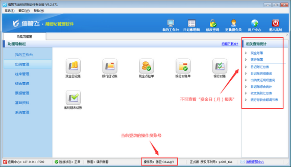 信管飛出納記賬軟件內包含豐富的記賬統計報表,如現金賬簿、銀行賬簿、資金日(月)報表、收支類別匯總表等。如果不希望員工賬號登錄后查看到這些報表,如何設置呢?本篇文章以信管飛出納記賬軟件專業版為例演示一下出納記賬軟件內如何設置操作員不可查看資金日(月)報表?    登錄軟件,在功能導航窗點擊“系統管理”—》“操作員及授權”,進入“操作